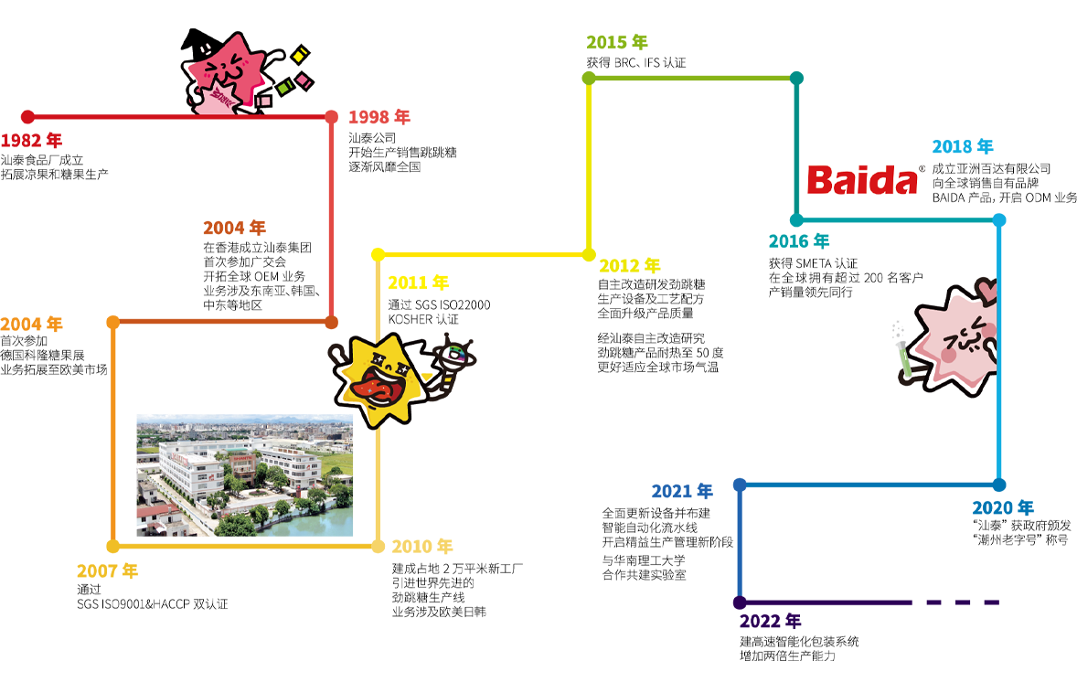 公司发展至今已实现了劲跳糖全产业链制造, 自有两个总占地超2 万平方米的现代化工厂, 严格按照GMP 标准建造生产车间, 自2004 年先后获得了 HACCP、ISO22000、IFS、BRC、HALAL、KOSHER、SMETA 等多项世界一流食品安全认证。汕泰自 2010 年起,自主研发劲跳糖生产设备, 持续提升劲跳糖的工艺技术水平, 现今的第3 代劲跳糖产品可稳定耐温至52℃ , 具有较强的市场竞争力。